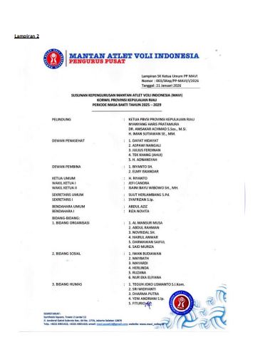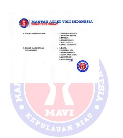 Kepengurusan MAVI Korwil Kepri 2025 – 2029 dinahkodai H. Riyanto (Ameng) sebagai Ketua Umum, didampingi Suut Herlambang sebagai Sekretaris Umum, dan Bendahara Umum Abdul Aziz bersama jajaran pengurus lainnya yang siap mengemban amanah membesarkan organisasi dan berkontribusi bagi kemajuan olahraga voli di Kepulauan Riau.