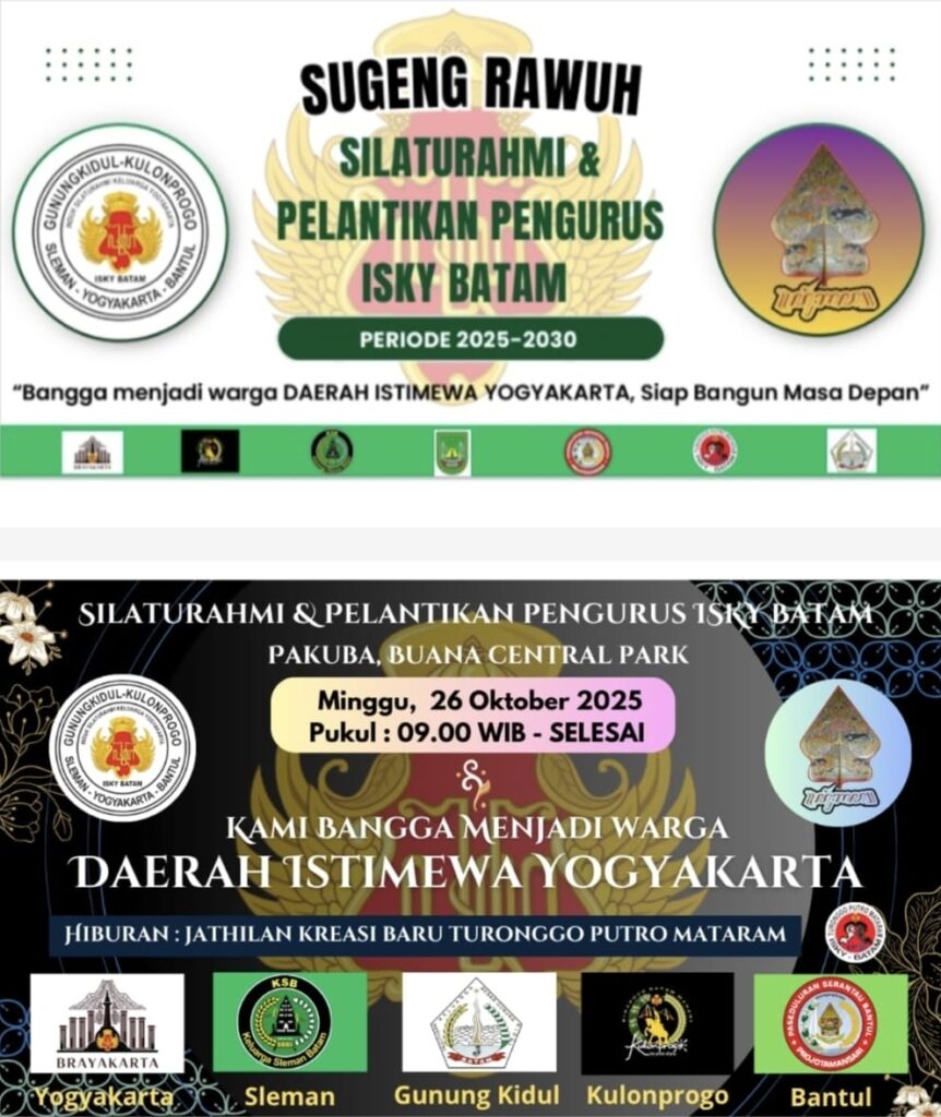 Bacakepri.com – Sukatmanto resmi dilantik sebagai Ketua Umum Induk Silaturahmi Keluarga Yogyakarta (ISKY) Kota Batam periode 2025–2030 dalam acara yang berlangsung khidmat di PAKUBA, Batuaji, Minggu (27/10/2025). Pelantikan ini menjadi tindak lanjut dari hasil Musyawarah Besar (Mubes) pertama ISKY Batam yang digelar 6 Juli 2025 lalu, sekaligus menandai babak baru bagi warga asal Daerah Istimewa Yogyakarta (DIY) di Batam untuk memperkuat kebersamaan lintas paguyuban Sleman, Bantul, Gunungkidul, Kulon Progo, dan Kodya Yogyakarta.